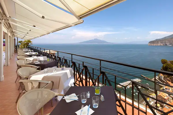 Dining at the Hotel Bristol is a delight. The 7th-floor restaurant, with floor-to-ceiling windows, pairs breathtaking views of Sorrento with Italian and Mediterranean dishes crafted from fresh, local ingredients—some from the hotel’s own gardens.